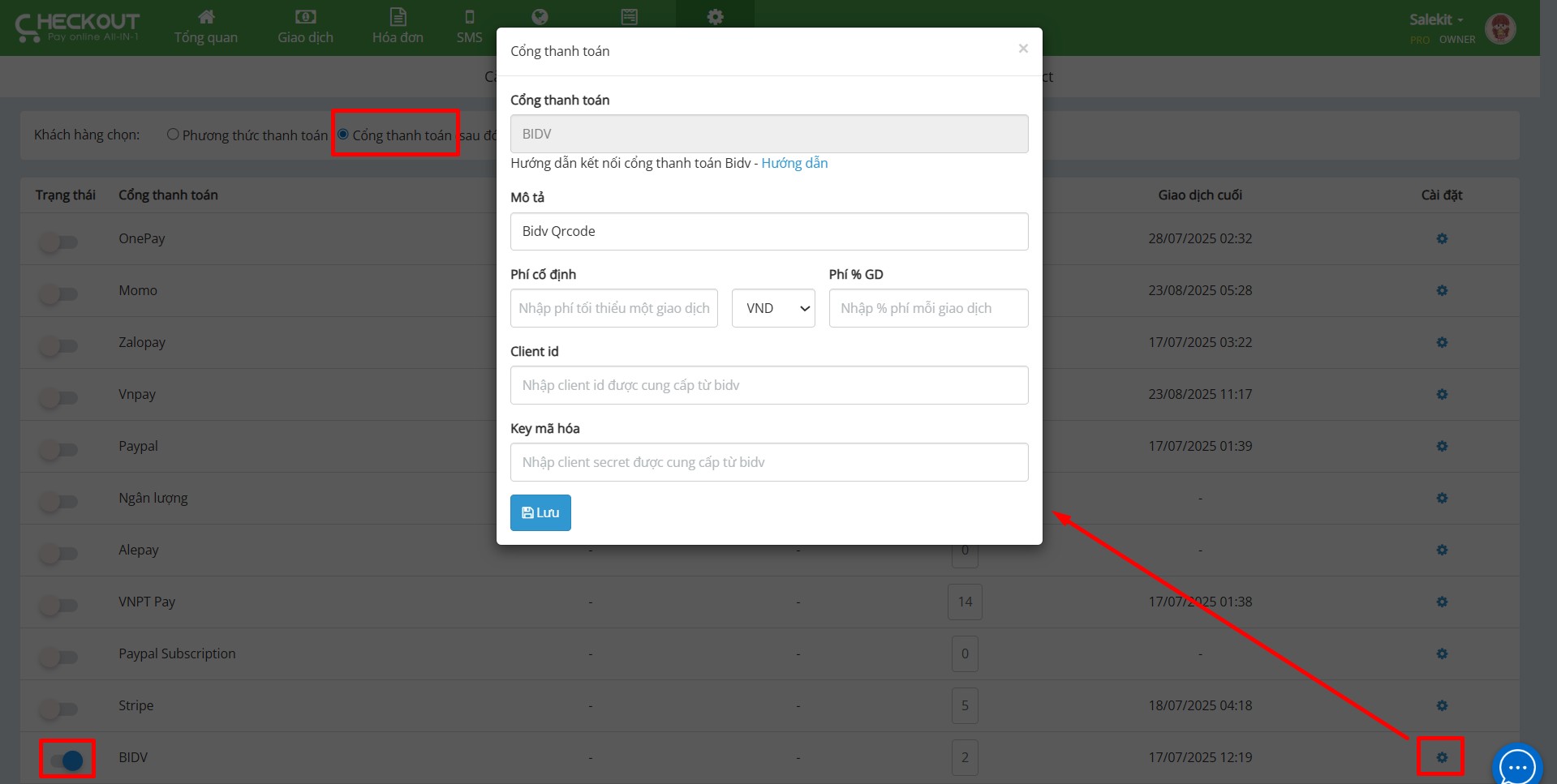 Bạn tích chọn Cổng thanh toán >> Bật On và nhấn vào Cài đặt tại cổng BIDV >> điền các thông tin >> Lưu.