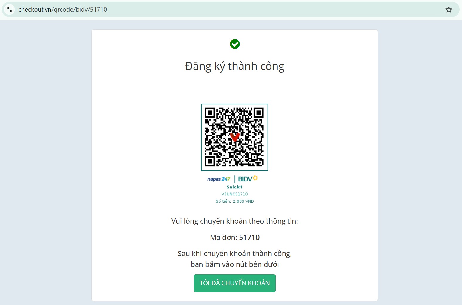 Bạn quét mã QR và tiến hành chuyển khoản theo nội dung tự động hiển thị: