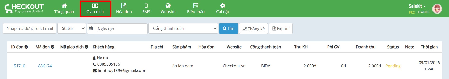 Các giao dịch thanh toán qua phương thức thanh toán BIDV sẽ được hiển thị tại mục Giao dịch của shop Checkout.vn để bạn dễ dàng quản lý.