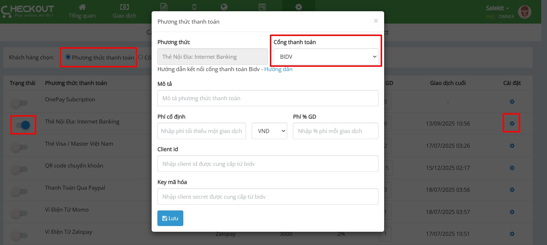 Bạn tích chọn Phương thức thanh toán >> bật On 1 phương thức thanh toán Thẻ nội địa: Internet Banking và chọn cổng thanh toán là BIDV >> điền thông tin >> Lưu.