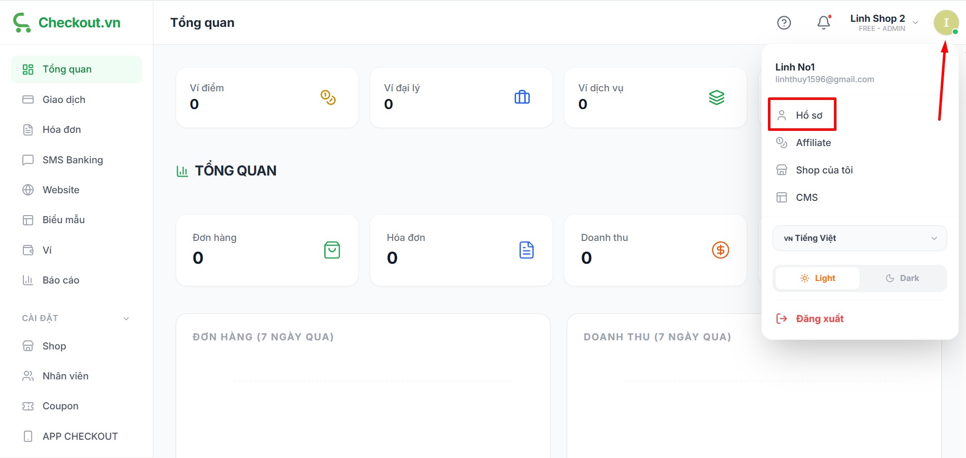 Bạn click vào avatar tài khoản ở góc trên cùng bên tay phải màn hình Dashboard (như hình bên dưới), chọn Hồ sơ