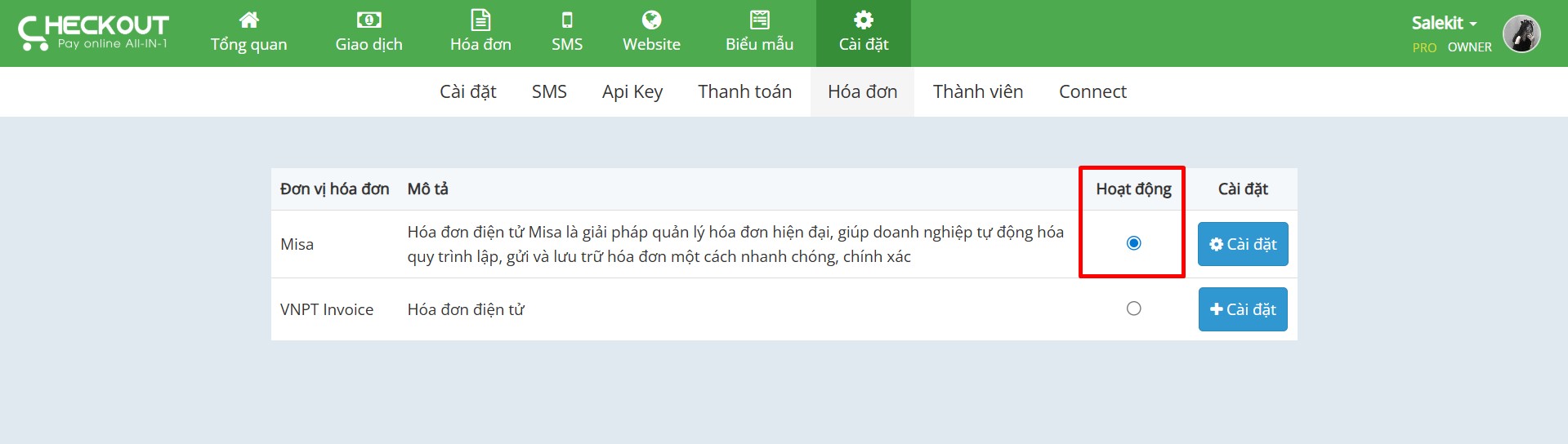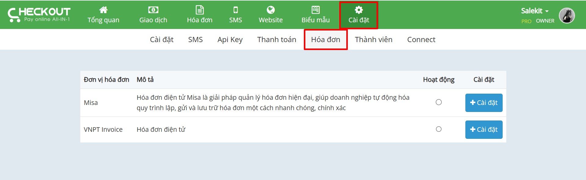 Hiện Salekit hỗ trợ kết nối 2 nền tảng xuất hóa đơn: VNPT Invoice, Misa.