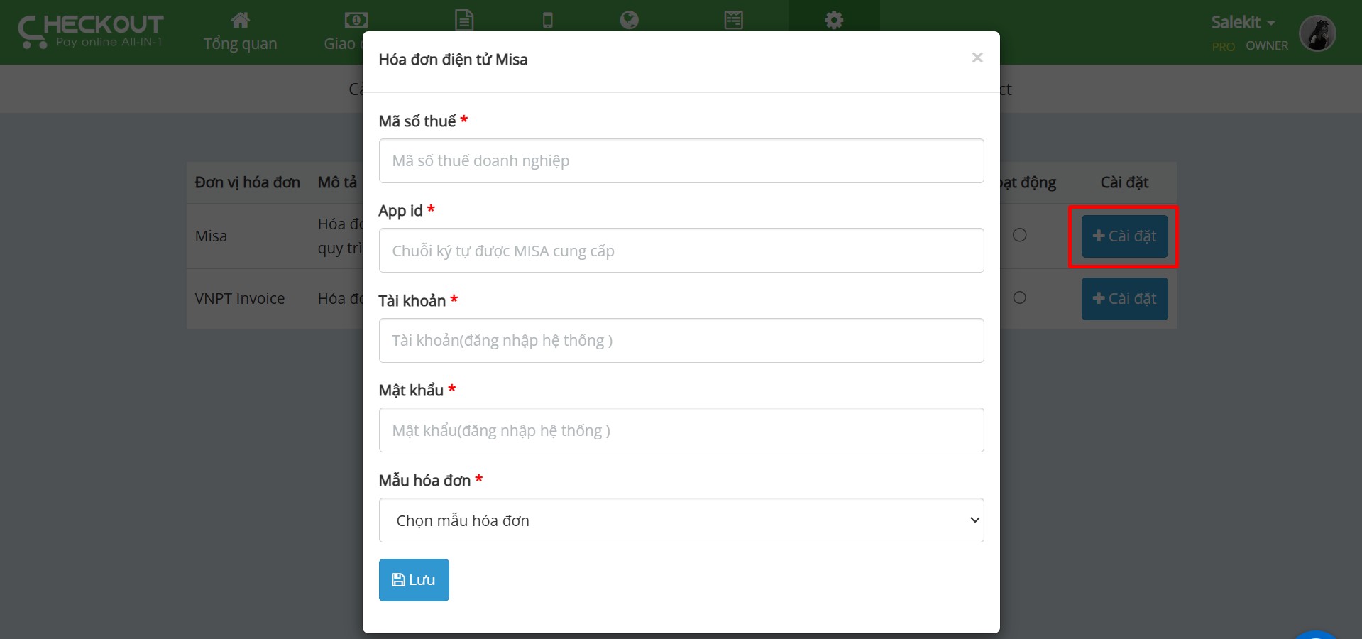 Checkout thêm tính năng Hóa đơn giúp bạn kết nối với các đơn vị hóa đơn như Misa, VNPT Invoice từ đó xuất hóa đơn cho khách mua hàng trên Salekit nhanh chóng, chính xác.