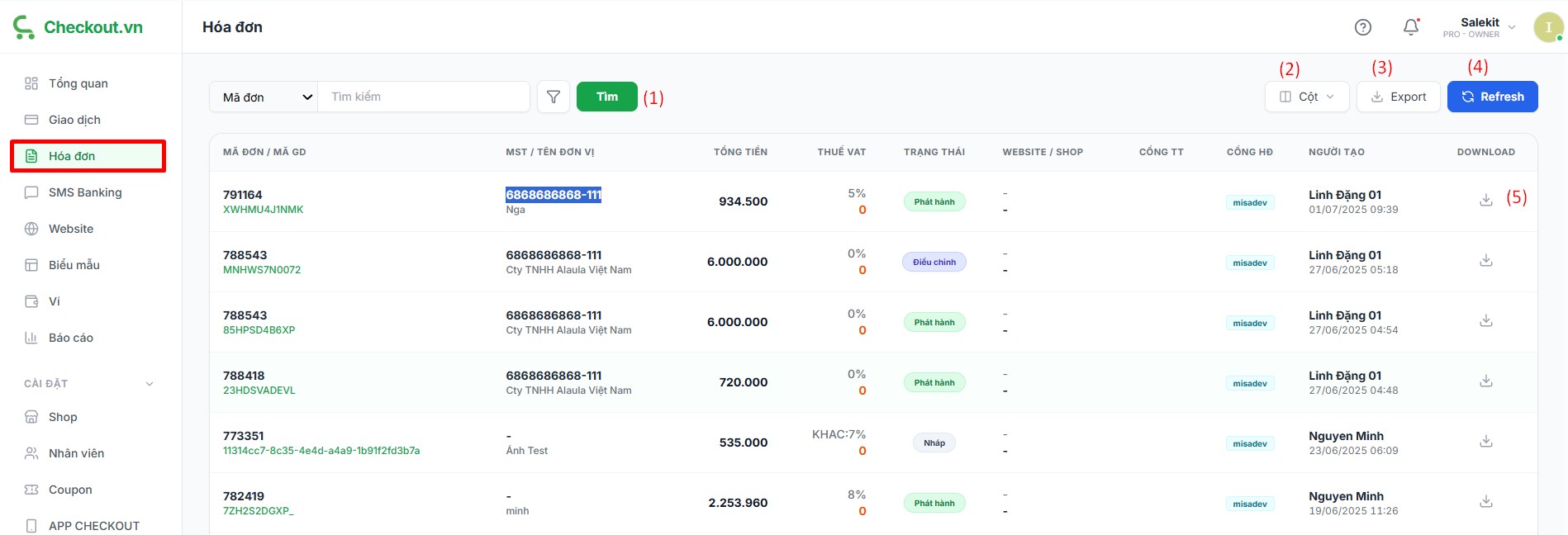 Bạn vào shop Checkout.vn >> mục Hóa đơn, tại đây bạn có thể: