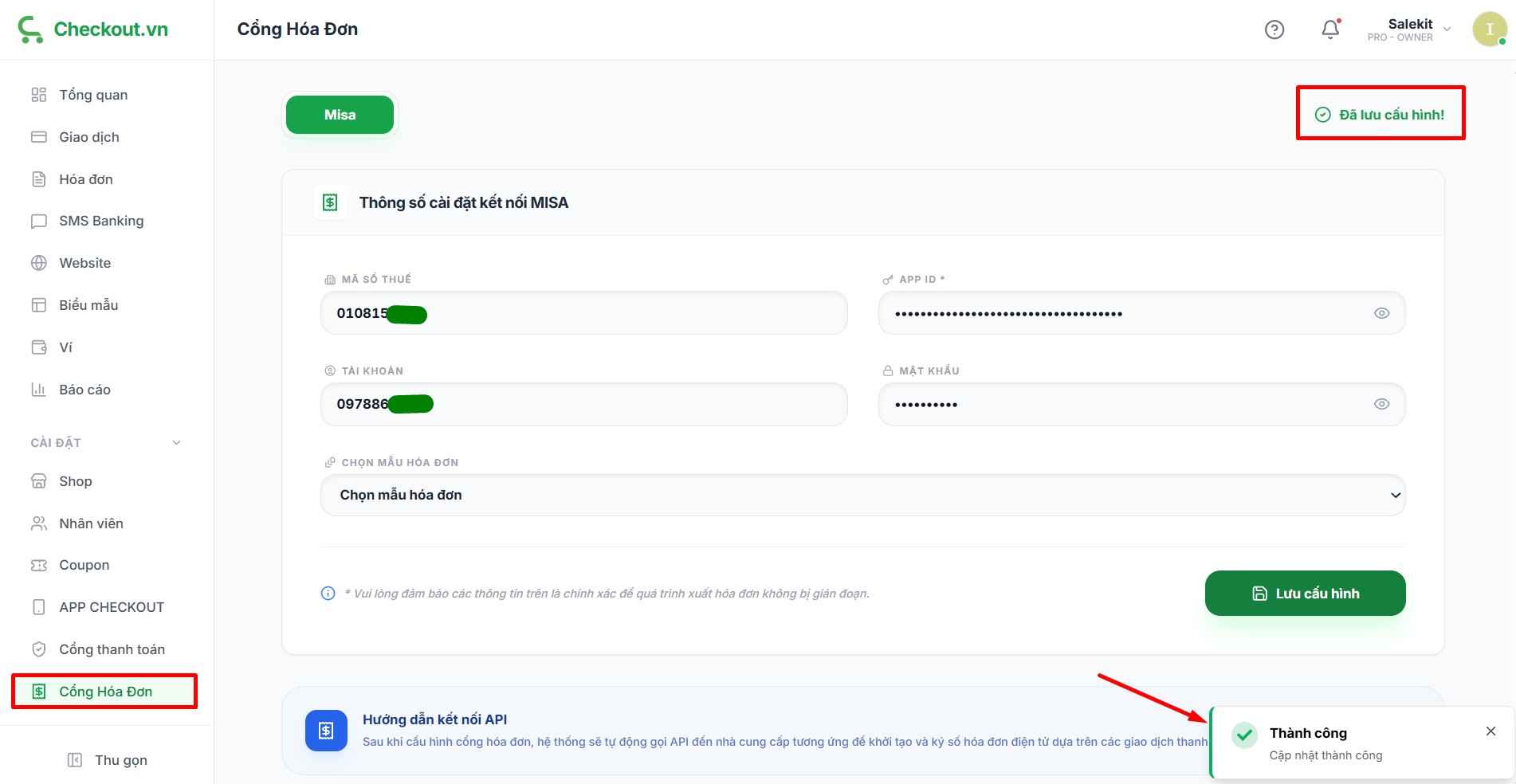 Hiện Salekit hỗ trợ kết nối nền tảng xuất hóa đơn Misa.