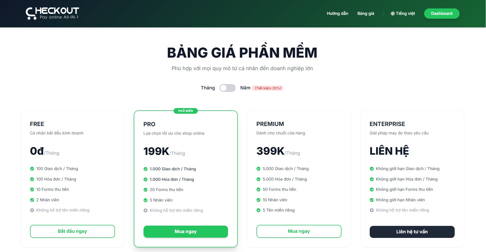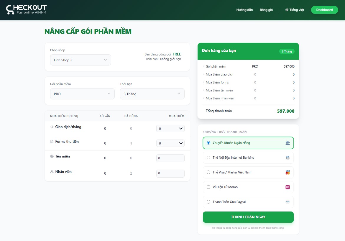 Checkout hiện có gói miễn phí (FREE) và gói trả phí (PRO, PREMIUM, ENTERPRISE). Các gói dịch vụ khác nhau sẽ có số lượng giao dịch/tháng, user đăng nhập và link form thanh toán khác nhau. Tùy vào nhu cầu sử dụng, bạn nên lựa chọn gói dịch vụ phù hợp để tối ưu hóa chi phí.