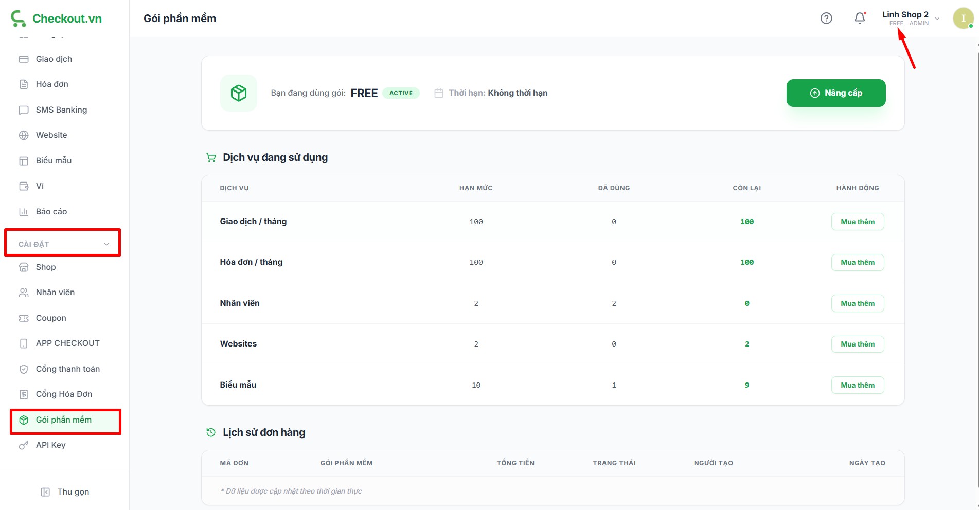 Ngay sau khi nhận được tiền thanh toán cho đơn hàng, gói dịch vụ của bạn sẽ được cập nhật. Bạn vào lại mục Cài đặt >> Gói phần mềm để kiểm tra chi tiết gói như thời hạn, số lượng nhân viên, links trong gói.