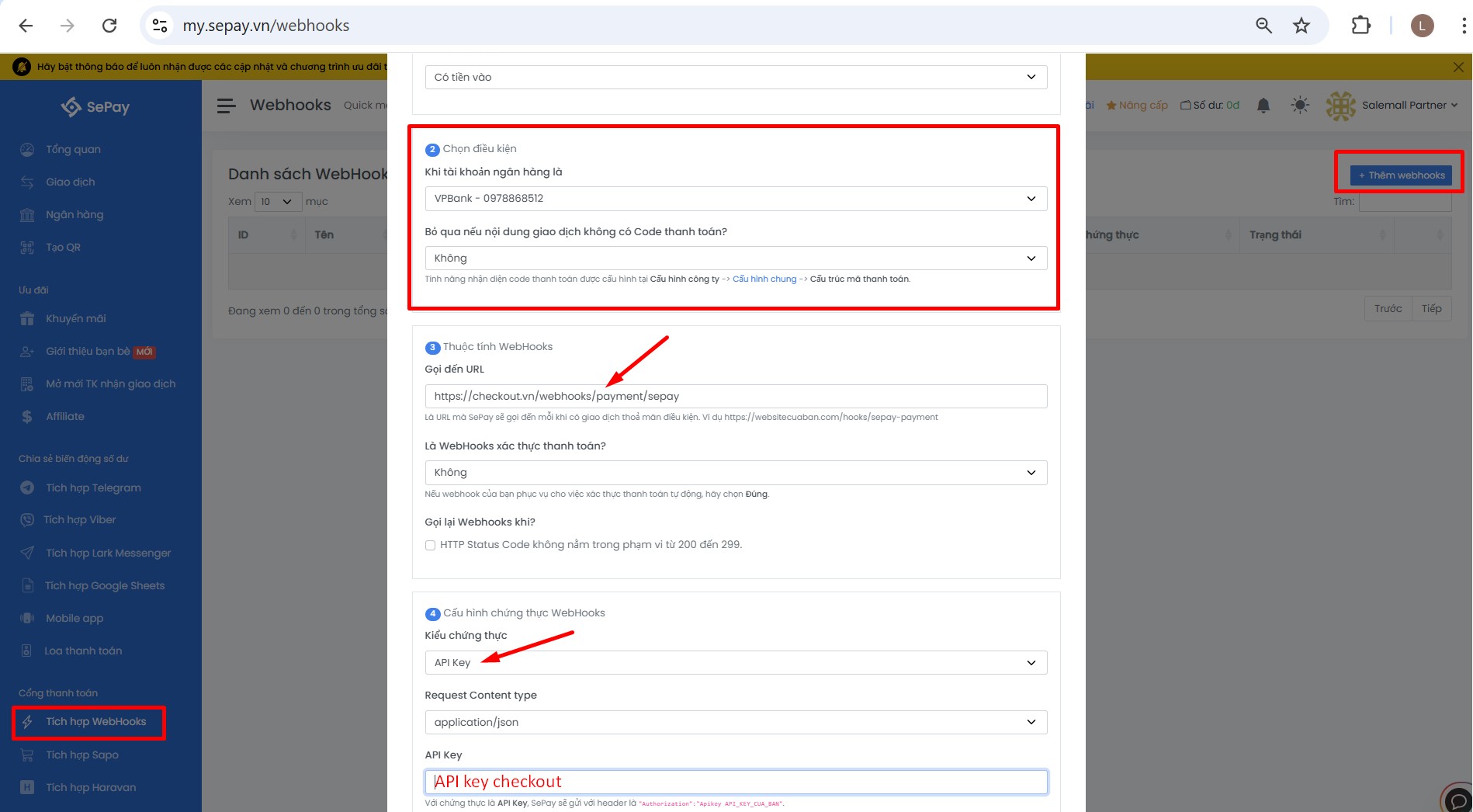 Ví dụ Kết nối checkout với Sepay qua api, bạn copy Api key của shop checkout và thêm vào trên Sepay.