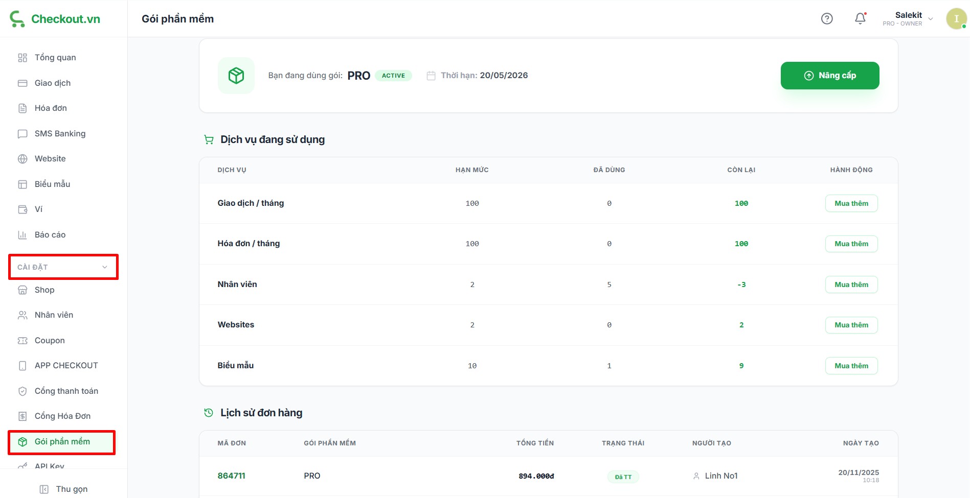 Sau khi kích hoạt thành công, bạn quay trở lại mục Cài đặt >> Gói phần mềm của shop để kiểm tra chi tiết gói.