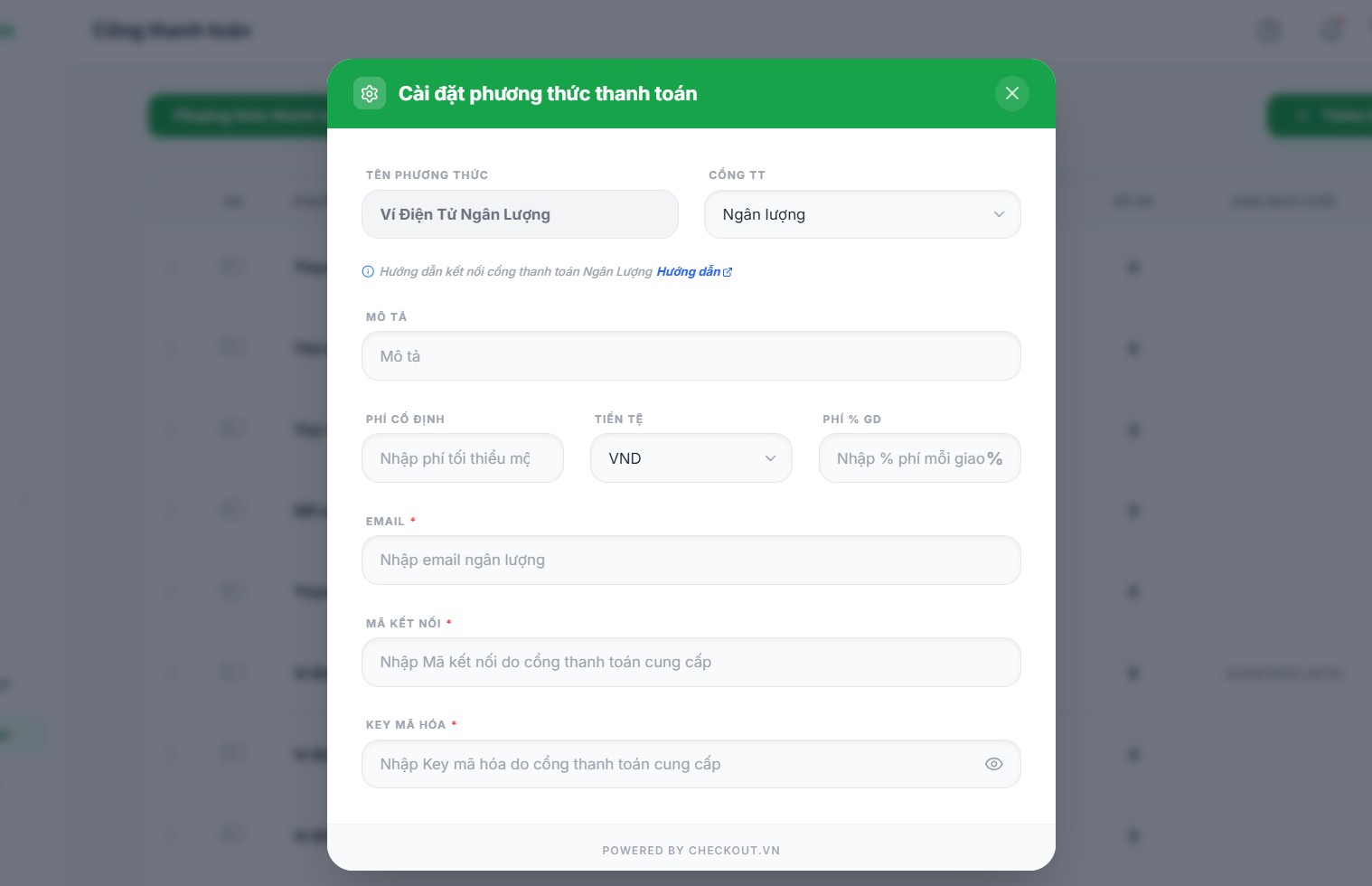 - Key mã hóa: Là thông tin Mật khẩu kết nối bên ví điện tử Ngân lượng