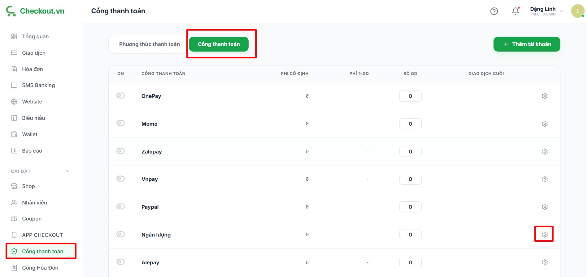 Bạn tích chọn Cổng thanh toán >> nhấn vào Cài đặt tại cổng Ngân lượng