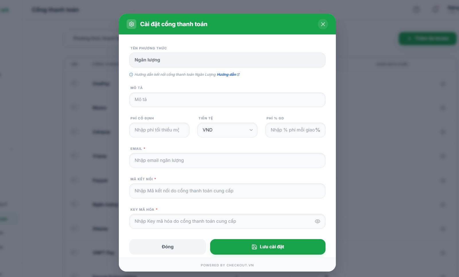 Tại đây bạn điền các thông tin yêu cầu (do phía Ngân lượng cung cấp) >> Lưu cài đặt và quay lại danh sách cổng thanh toán, bật On cổng Ngân lượng.