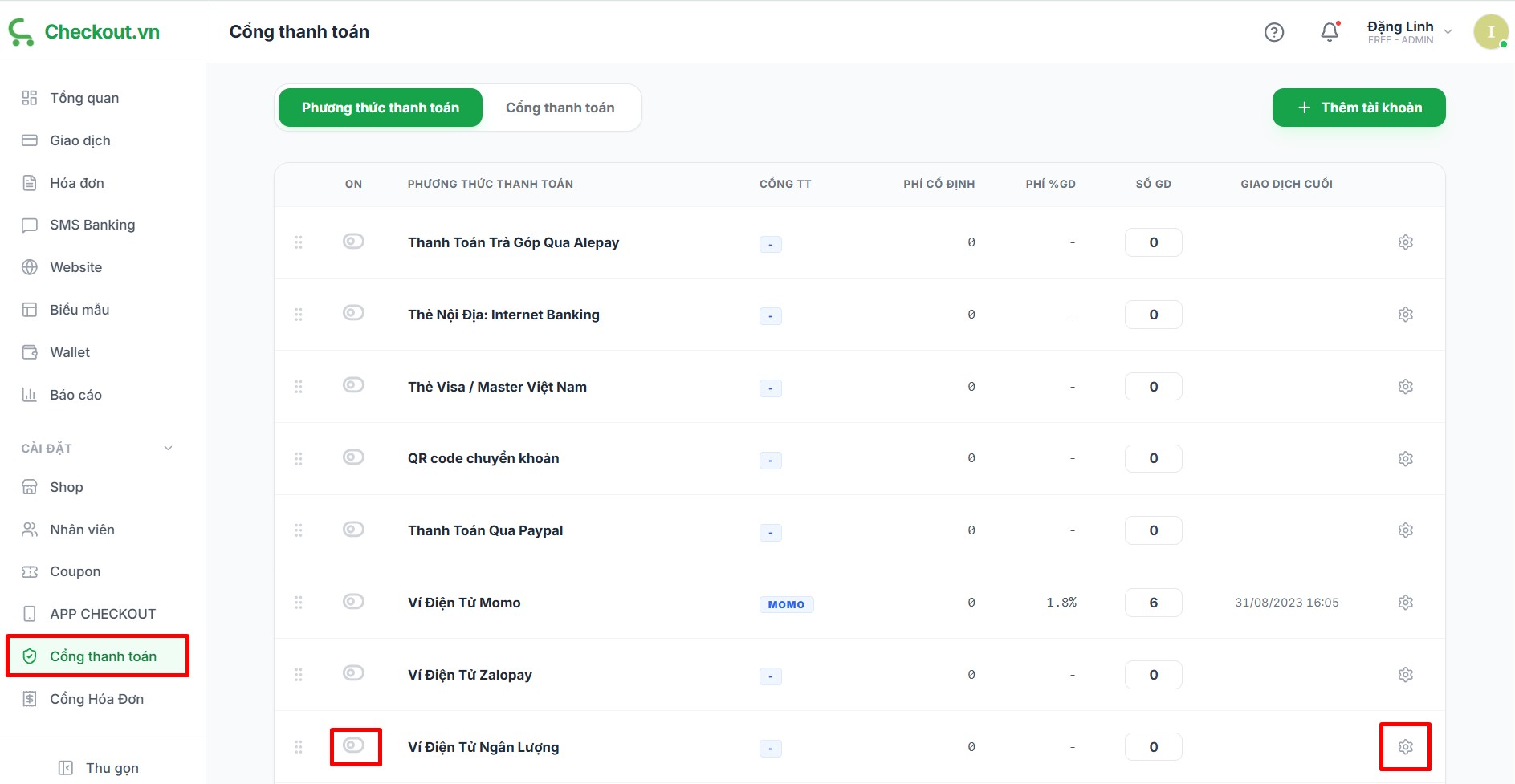 Bạn tích chọn Phương thức thanh toán >> bật On 1 phương thức thanh toán và chọn cổng thanh toán là Ngân lượng >> điền thông tin >> Lưu.