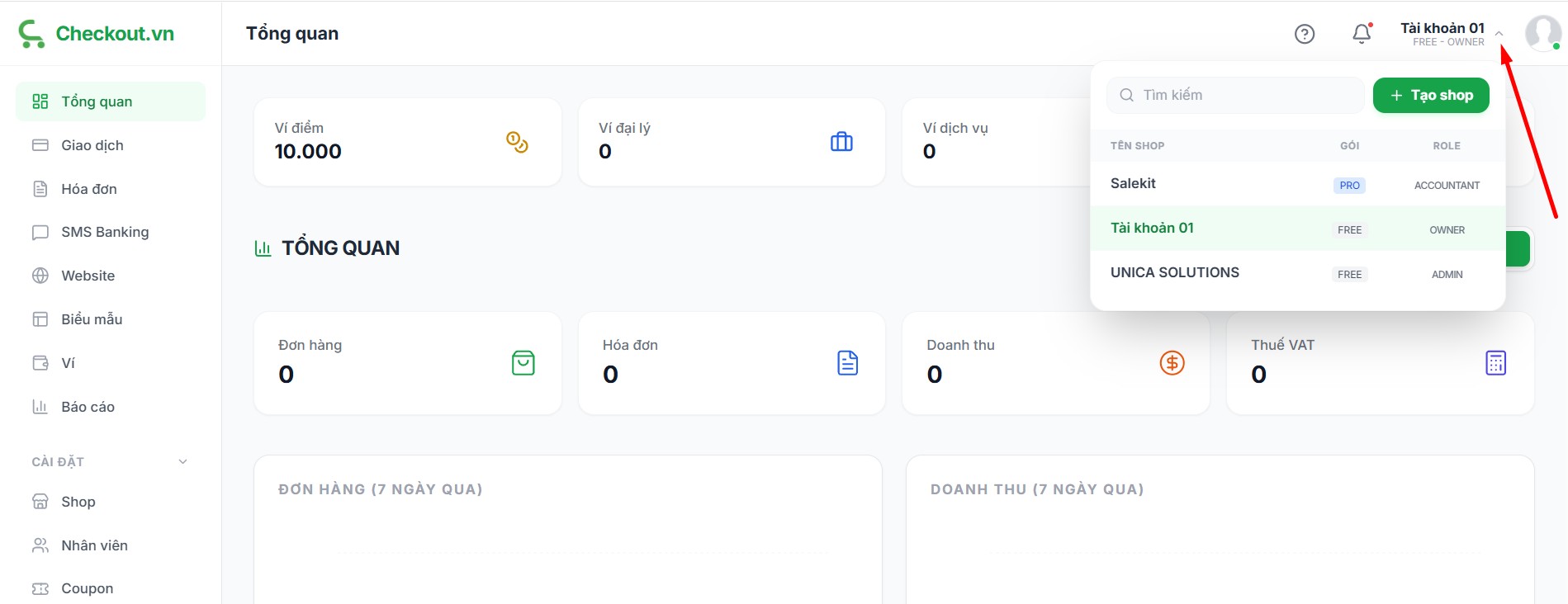 Sau khi phân quyền xong, nhân viên được phân quyền cần truy cập tài khoản Checkout của họ >> chọn quản lý shop >> chọn sang shop được phân quyền để làm việc.