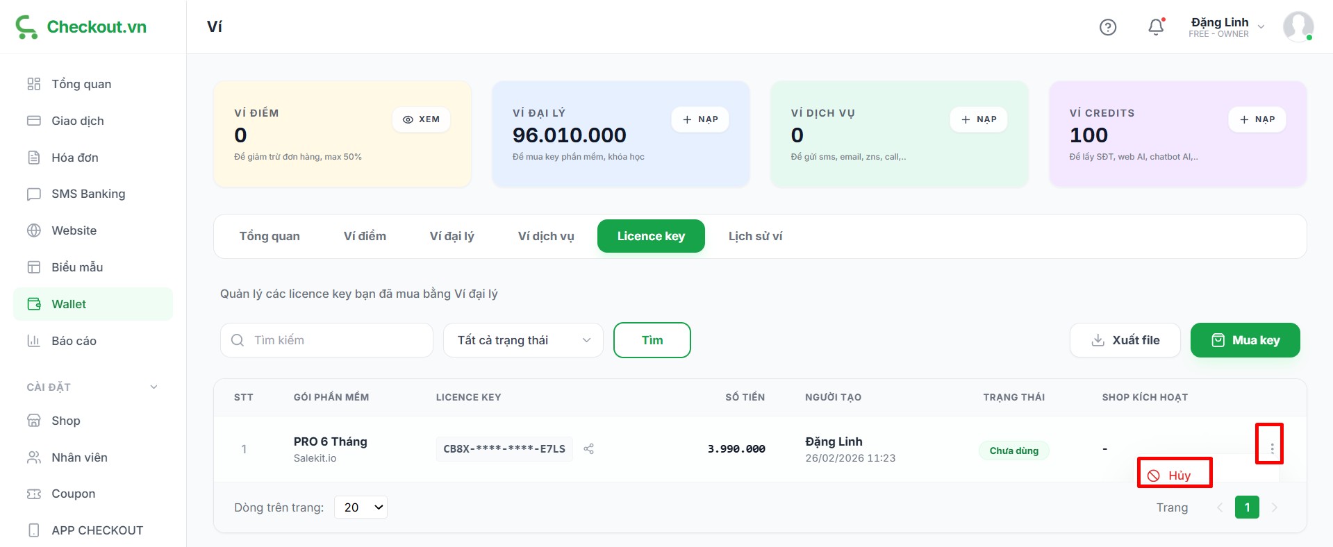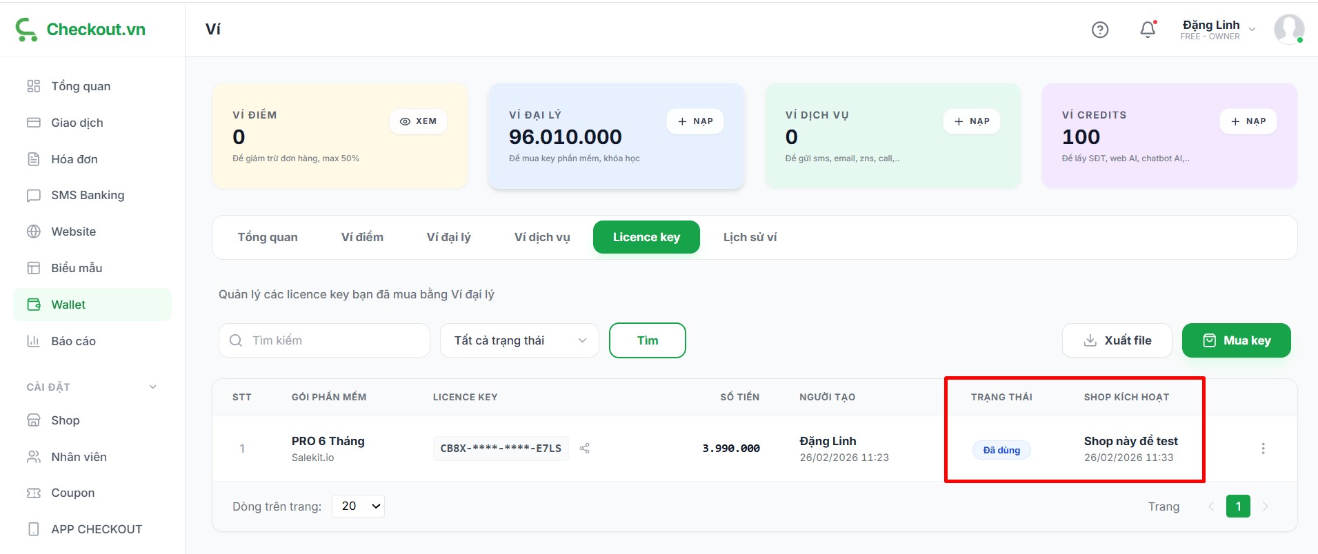 Số dư ví dùng để tạo License Key sử dụng hoặc bán lại cho khách hàng.