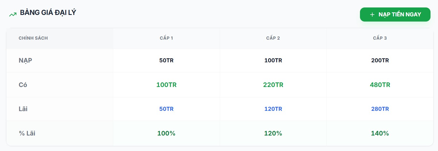 Dưới đây là bảng thống kê lãi đại lý sẽ nhận được tương ứng với số tiền nạp, nạp càng nhiều, lãi càng cao.