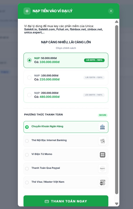 Bạn có thể dùng tiền trong ví đại lý của Checkout.vn để tạo licence key, bán cho khách hàng sử dụng các phần mềm của Salemall: Fchat.vn, Salekit.com, Salekit.io, Zinbox.net...